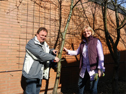 Der Fachberater Roland Pawelczyk zeigte der Gartenlehrerin Frau Pörtner, einem Schüler und Herrn Kurt Walter, wie Obstbäume - Süßkirsche und Äpfel, Kiwi und Feige - sowie Himbeeren, Stachel- und Brombeeren zu beschneiden sind.