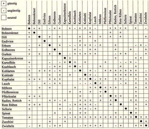 Konsequenter Mischkulturanbau in Abstimmung mit dem Fruchtwechsel ist sicher etwas für die Tüftler unter den Hobbygärtnern - ein jährlicher Pflanzenplan (mit Sortenangaben) gehört dazu und sicher auch ein wenig Praxiserfahrung, damit alles wie geplant funktioniert. Als Planungshilfe kann dabei die hier abgedruckte Tabelle dienen, wobei von Reihe zu Reihe oder aber schon in der Reihe gemischt werden kann.